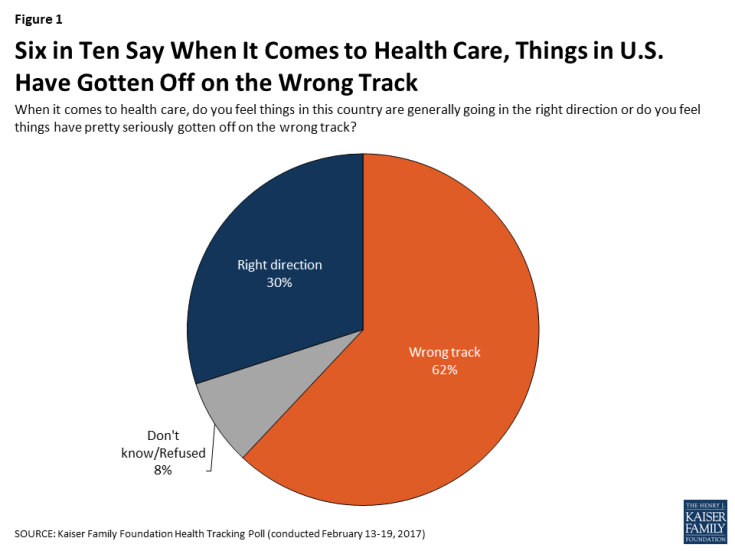 The February 2017 Kaiser Health Tracking Poll finds that Americans have concerns about the shifting landscape of health care in this country. Six in ten (62 percent) Americans say that when it comes to health care, things in this country have pretty seriously gotten off on the wrong track, compared to three in ten who say things are generally going in the right direction.