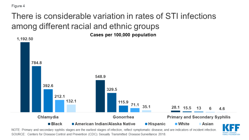 Due to a combination of social, structural, and economic inequities, HIV and other STIs disproportionately affect certain groups (Figure 4). In 2018, Blacks accounted for 38% of reported gonorrhea cases and 33% of primary and secondary syphilis cases, despite comprising just 13% of the population. Blacks also accounted for 42% of new HIV diagnoses in the U.S in 2018. Hispanics are also disproportionately affected, accounting for 27% of persons newly diagnosed with HIV and representing 18% of the population in 2018.