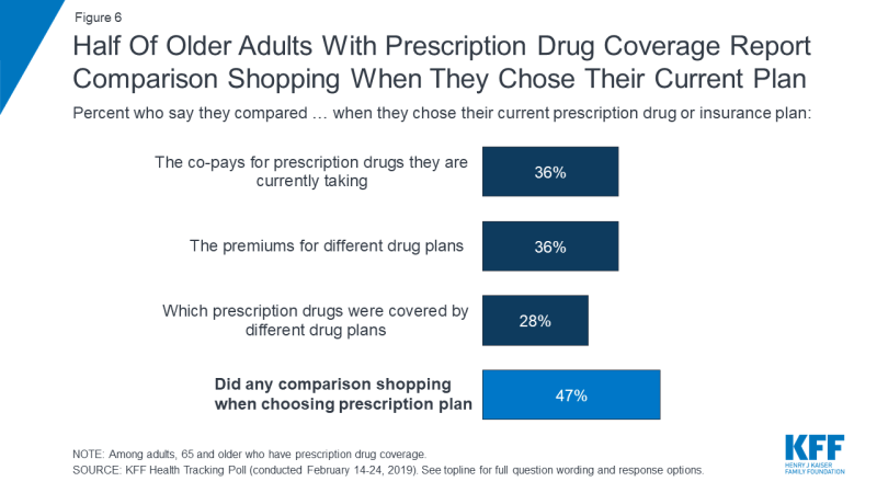 Less than four in ten older adults report comparing plan premiums (36%) or co-pays for prescription drugs they were currently taking (36%), and about three in ten (28%) say they compared which prescription drugs were covered by each of the different drug plans. Overall, about half (47%) of older adults who have prescription drug coverage say they did some comparison shopping when choosing their current prescription drug plan.