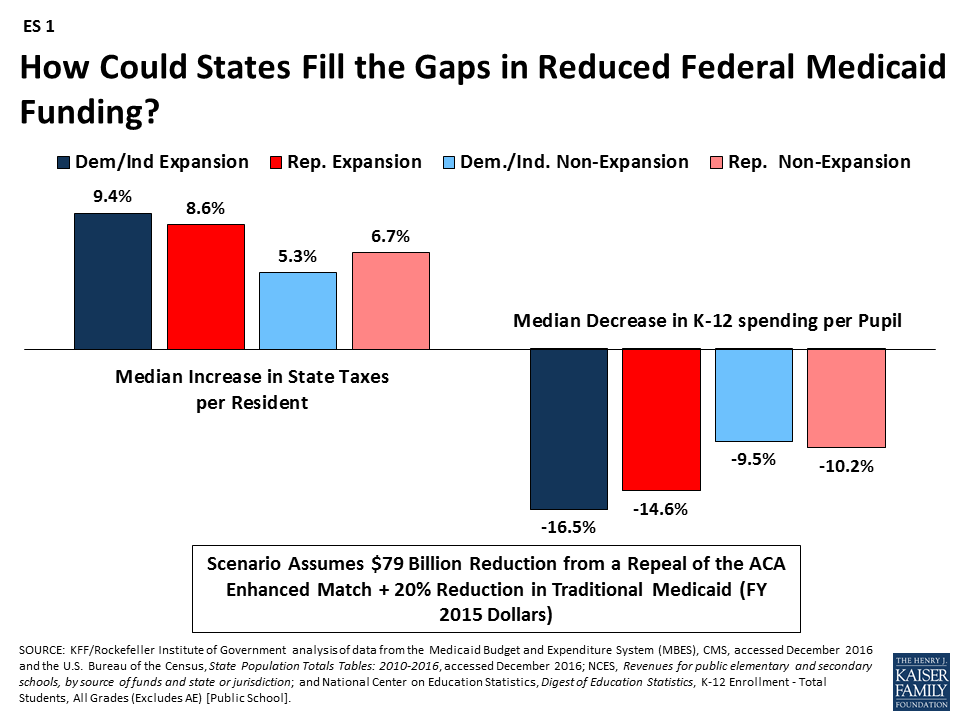 This analysis found that under various scenarios of reductions in federal Medicaid funding in FFY 2015, states would have to increase their per resident state Medicaid spending by a median of 17.2% to 40.3% to maintain total Medicaid spending. To pay for these increases, states could increase total state tax revenue per resident by a median of 3.5% to 8.1% or decrease K-12 education funding per pupil by a median of 10.9% to 24.1%. Because states have different starting points for taxes and education spending, the effects could vary by state and by groups of states. However, due to assumptions about changes in the ACA enhanced match rate, states that have adopted the Medicaid expansion will experience larger implications from the federal Medicaid funding reductions; this is true across states with Republican and Democratic governors. This increased budget pressure could make it difficult for states to maintain the Medicaid expansion. Federal funding reductions could have a disproportionate effect on states that spend less per resident on Medicaid and education, and have lower tax revenues, typically high poverty states. The responses presented in the report are illustrative. In reality, each state would make different policy choices and states could implement a combination of approaches, or not completely offset the federal reductions. However, the results show that depending on the size of the gap to fill, the responses could be significant.