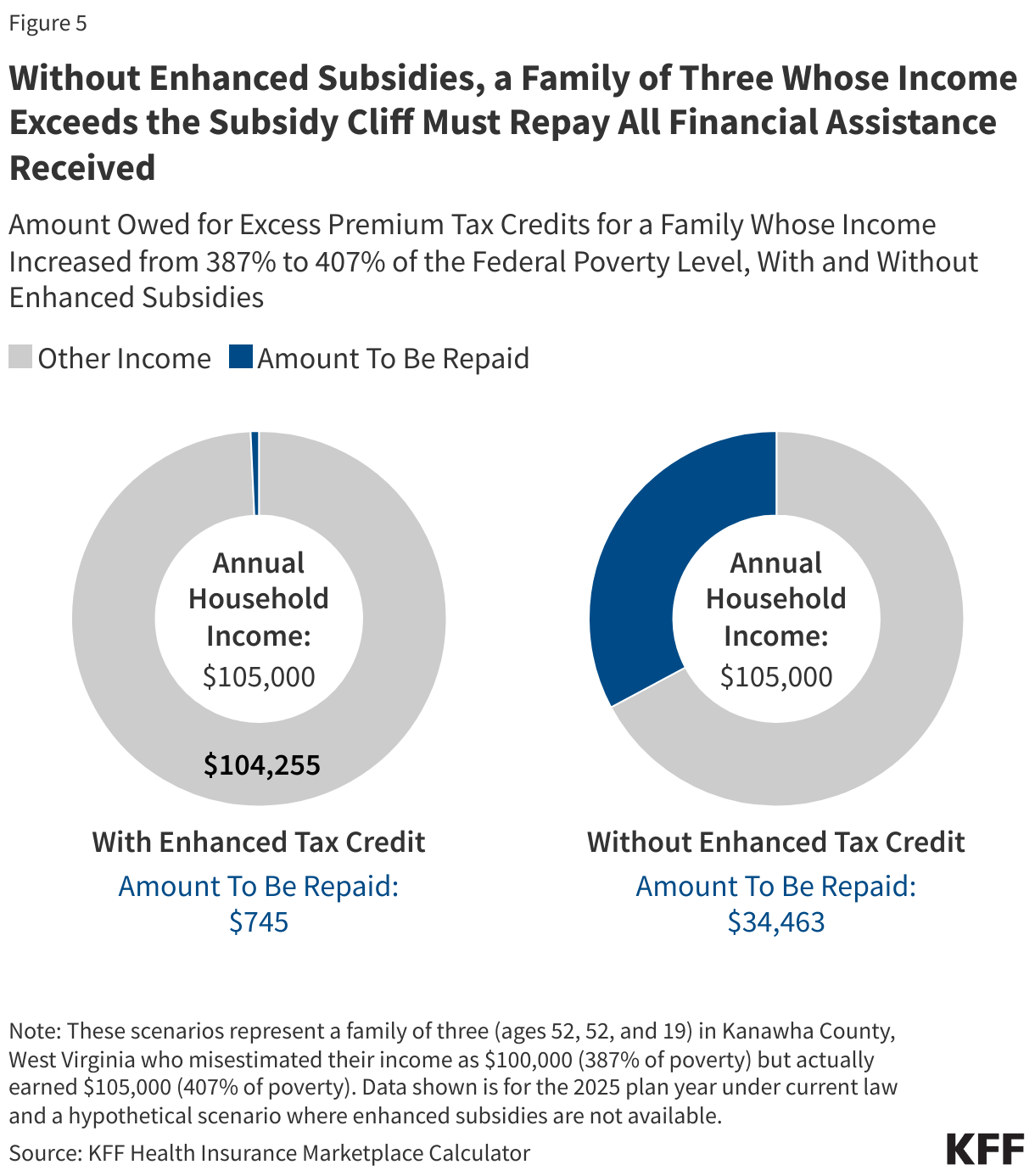 Although repayment caps do not apply to households with incomes above 400% of FPL ($60,240 for an individual in 2025), the enhanced premium tax credits currently limit the amount such enrollees may need to pay for ACA Marketplace coverage. That is, even if their income exceeds expectations, they may remain eligible for some level of premium subsidy. For example, consider a family of three (aged 52, 52, and 19) in Kanawha County, WV, who estimated their income at $100,000 (387% FPL) but ultimately earned $105,000 (407% FPL). With the enhanced subsidies, they would receive a $34,463 premium tax credit but would have been eligible for $33,718—a difference of $745. They would be required to repay only the $745 when filing taxes—less than 1% of their annual income. If the enhanced subsidies expire, however, this family’s income above 400% of poverty would disqualify them for any tax credits . By falling off the subsidy cliff, they would be required to repay the entire premium tax credit of $34,463, or about 33% of their annual income.