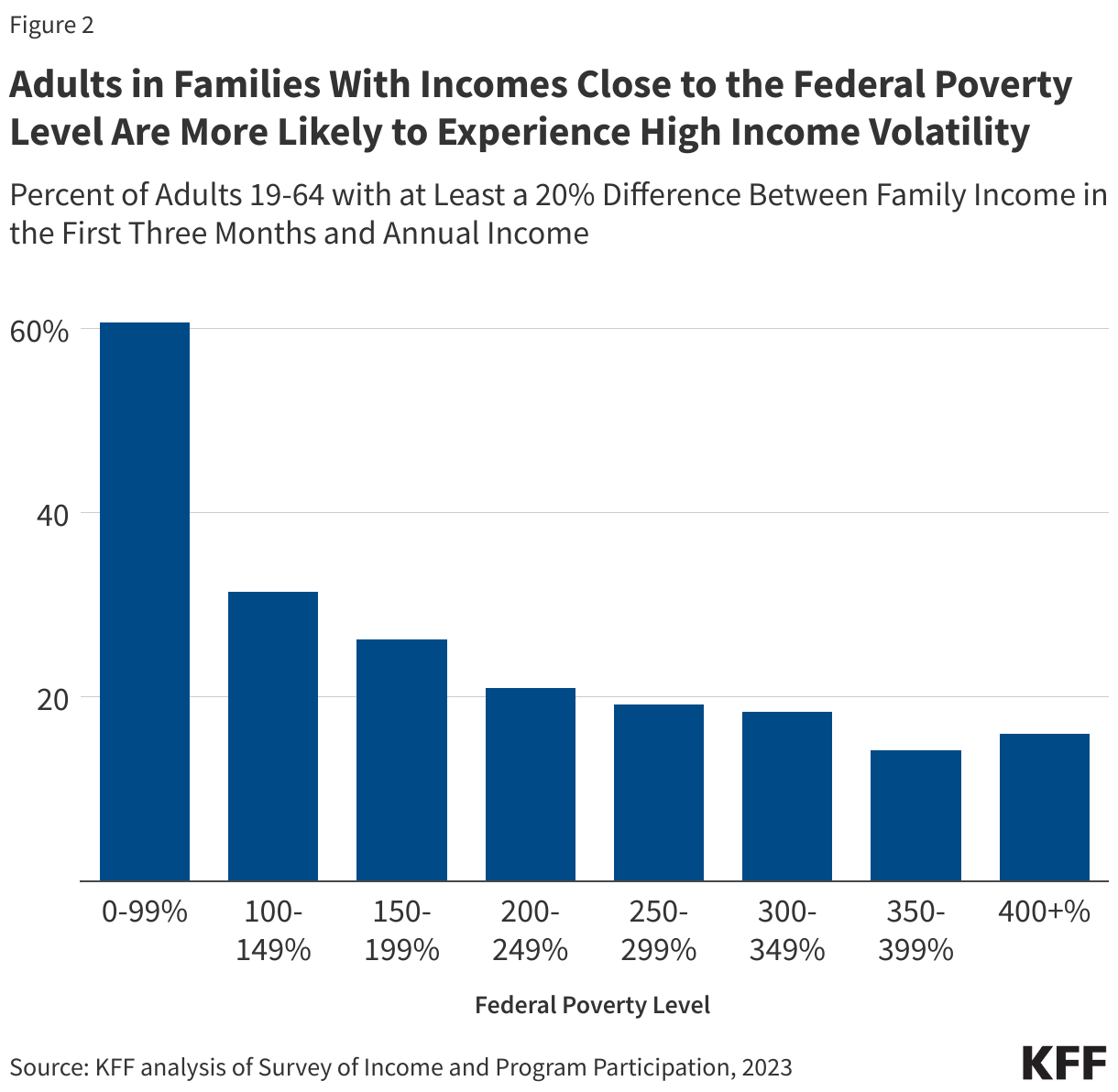 A family’s poverty level can change for many reasons, including shifts in household income or changes in family structure, such as birth, marriage, or divorce. In some cases, such as among seasonal workers, families may anticipate uneven income over the year. In others, these changes are unexpected. Families with an adult that was laid off during the year were more likely to have high income variability. Among adults aged 19 to 64, 42% of those in families where someone was looking for work or had been laid off for at least three weeks during the year experienced high-income volatility, compared to 18% of those in families without such disruptions. Other factors associated with high income volatility among non-elderly adults included: