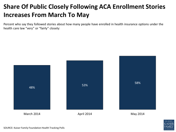 News about the kidnapping of a large group of school girls in Nigeria and the ongoing conflict between Ukraine and Russia caught the public’s attention this month, with large shares (69 percent and 65 percent respectively) saying they followed the stories “very” or “fairly” closely. Not far behind these headline-grabbing stories, nearly six in ten (58 percent) report closely following news about how many people have enrolled in health insurance options under the ACA. This share is up from 55 percent in April and 48 percent in March.