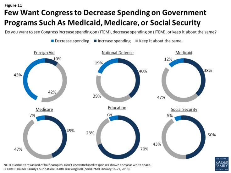 - As Congress continues to work on a federal budget, some lawmakers have suggested making cuts to government programs such as Medicare and Medicaid. This poll finds that language can matter in framing questions about government spending on such programs. About one in ten say they want to see Congress decrease spending on Medicare (7 percent) and Medicaid (12 percent). When the public is asked about government spending using broader terminology like “welfare programs” or “entitlement programs” rather than a specific name, larger shares of the public say they want to see spending decrease (32 percent and 27 percent, respectively).