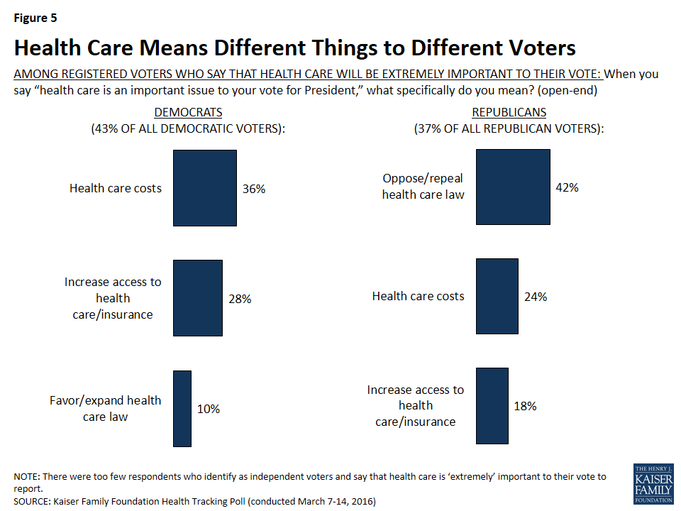 Of the 37 percent of Republican voters who were asked what they meant when they say health care is extremely important to their vote, four in 10 (42 percent) mention opposing or repealing the health care law with many fewer mentioning health care costs (24 percent) and increasing access to health care and insurance (18 percent). On the other side, smaller shares of Democratic voters who were asked what they mean when they say health care is extremely important to their vote mention the health care law (5 percent mention opposing or repealing the law and 10 percent favoring or expanding it), but they are more likely to say increasing access to health care and insurance (28 percent) and cost-related concerns (36 percent).