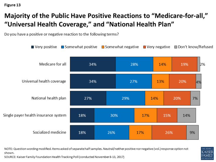 Politicians have long been using a variety of terms to describe the idea of expanding health insurance coverage to all Americans including recent discussion of “Medicare-for-all” during the 2016 presidential election. This month’s tracking poll explores the public’s reaction to a few of these terms and finds six in ten of the public say they have a positive reaction to the term “Medicare-for-all” (62 percent), “universal health coverage” (61 percent), and “national health plan” (57 percent). Fewer report a positive association to “single payer health insurance system” (48 percent) or “socialized medicine” (44 percent).