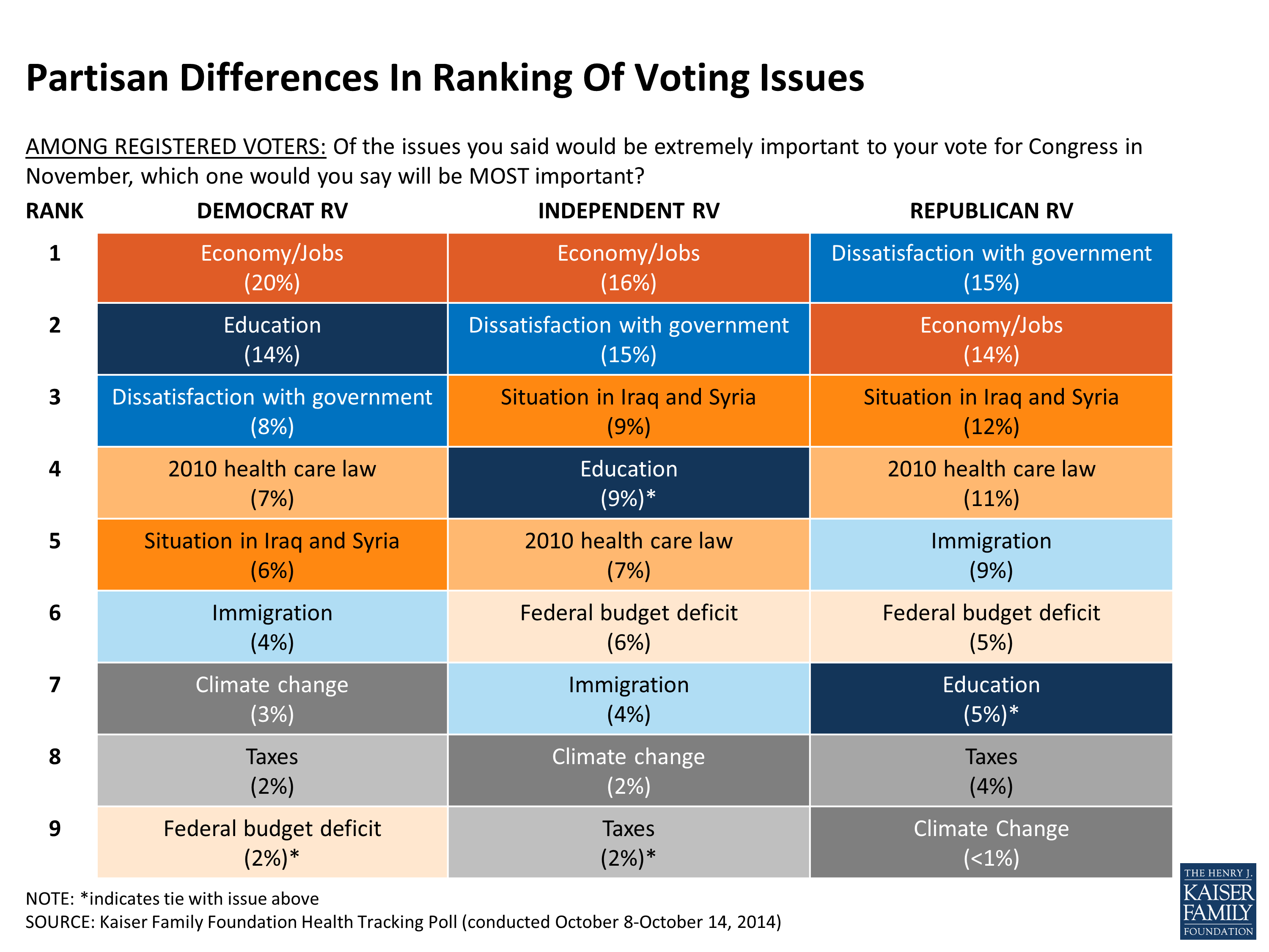 In the final Kaiser Health Tracking Poll before the 2014 midterm elections in November, the Affordable Care Act (ACA) continues to be just one of several issues on voters’ minds. Less than 1 in 10 registered voters (8 percent) identify the ACA as the most important issue to their vote, ranking 5th behind the economy (16 percent), dissatisfaction with government (12 percent), education (10 percent) and the situation in Iraq and Syria (9 percent). The ACA ranks 4th for Democrats, Republicans, and independents alike. Just over half of voters say they’re tired of hearing Congressional candidates talk about the ACA and wish they would move on to other issues, while 44 percent say they want candidates to continue the discussion. Meanwhile, as campaigns make their final appeal to voters, 6 in 10 report seeing political advertising related to the ACA, with more saying they have seen mostly negative advertising about the ACA rather than mostly positive.