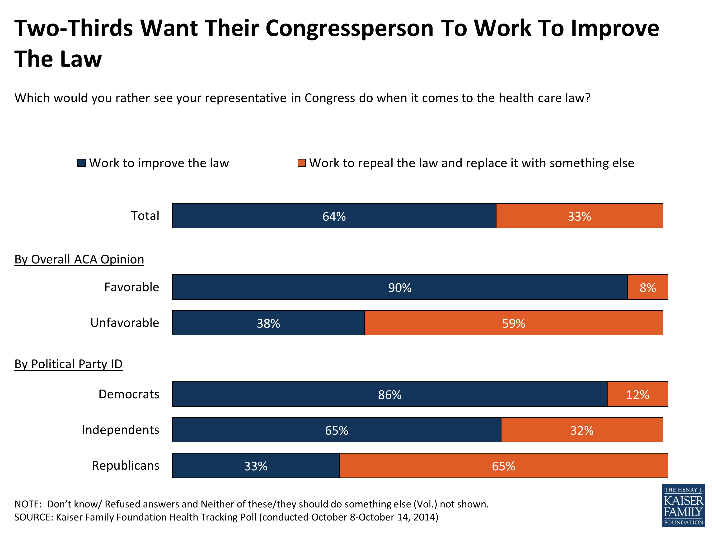 Despite the negative tilt in opinion towards the law overall, nearly two-thirds of the public (64 percent) would rather see their representative in Congress work to improve the law than repeal and replace it with something else (33 percent). A large majority of Democrats (86 percent) want their representative to work to improve the law while a majority of Republicans would rather see their representative work to repeal and replace it (65 percent). Still, sizeable shares of Republicans (33 percent) and those with an unfavorable view of the law (38 percent) say they would rather see their representative work to improve the law than work to repeal and replace it.