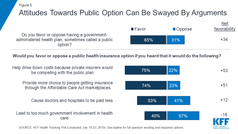 - The poll also finds a slight dip in overall favorability of the idea of a national Medicare-for-all plan. About half (51%) of the public now say they favor such a proposal compared to 56% in April 2019. On the other hand, nearly two-thirds of the public (65%) favor a public option, which would compete with private health insurance plans and be available to all Americans. But as with polling on Medicare-for-all, attitudes toward this change to the current health care system can be swayed by common arguments. For example, net favorability towards such a plan ranges as high as +53 and as low as -18 after hearing arguments either in favor of or against a public option.