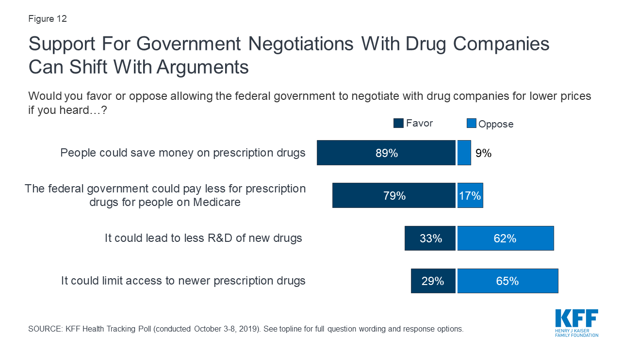 - Large majorities of the public favor various policy options aimed at lowering the cost of prescription drugs, including over eight in ten who favor allowing the federal government to negotiate with drug companies to get a lower price on medications for people with Medicare and allowing negotiations that would apply to both Medicare and private insurance. However, support can shift with arguments for and against government negotiation of drug prices.