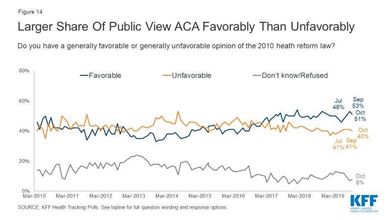 Overall opinions of the Affordable Care Act have remained relatively unchanged for the past two years since the Republican efforts to repeal the law. Half of the public (51%) this month hold favorable opinions of the ACA while four in ten hold a negative opinion of the law. The public still holds largely partisan views of the ACA as eight in ten Democrats (81%) have a favorable view of the ACA compared to half of independents (51%) and about one-sixth of Republicans (15%).