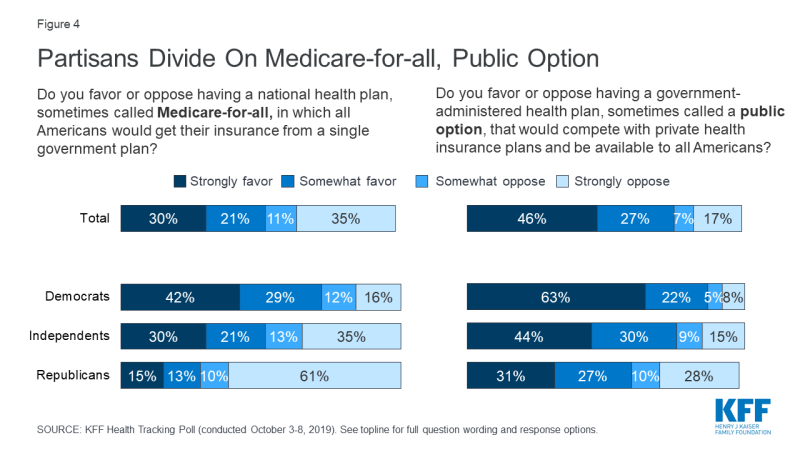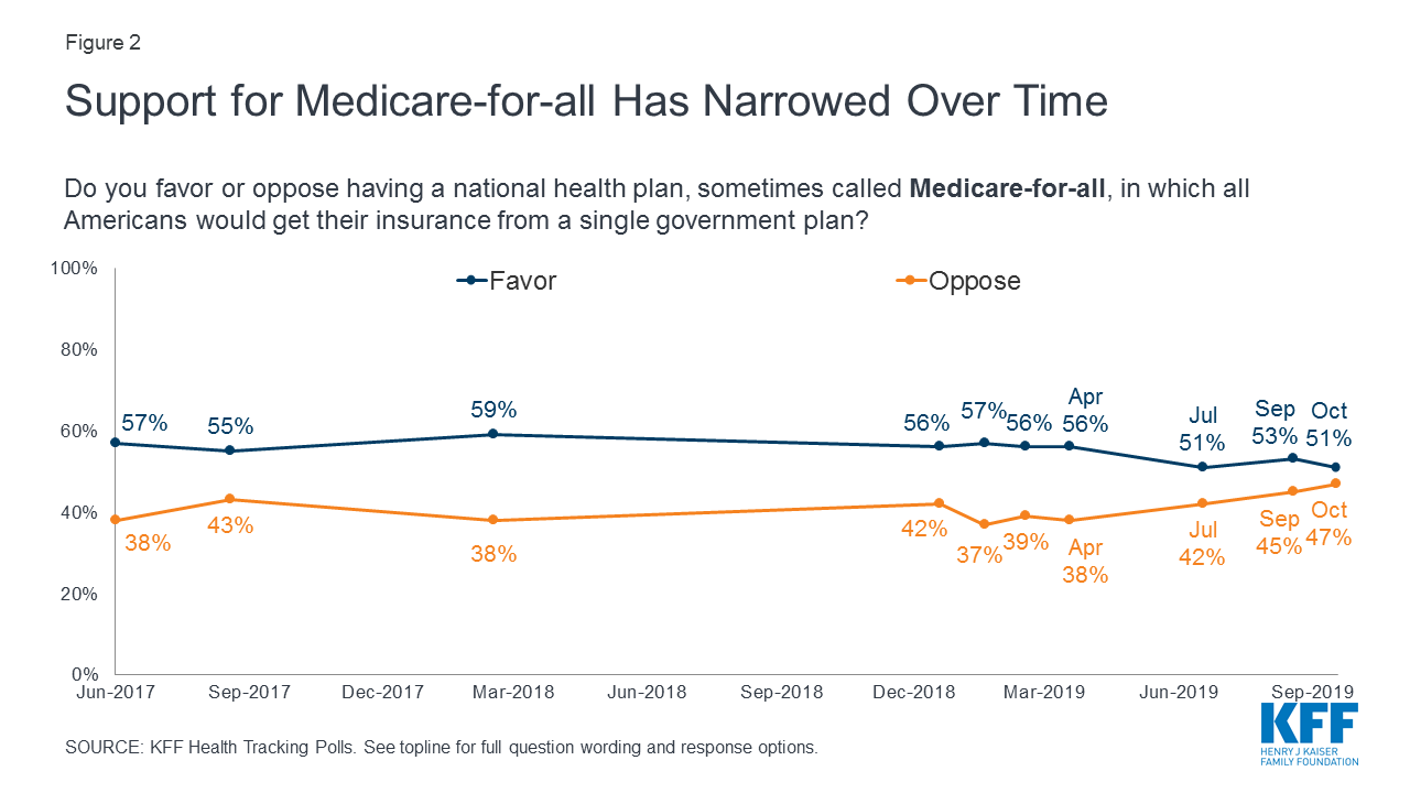 - Support for Medicare-for-all has narrowed in recent months, with 51% now saying they favor a national health plan and 47% opposed. At the same time, support for a public option has inched up since July, with 73% now saying they favor a government plan that would compete with private health care plans and 24% opposed.