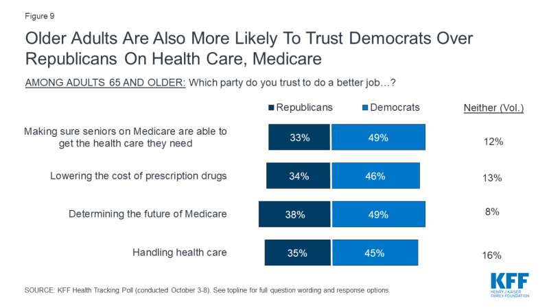 Despite President Trump’s health care speech in Florida earlier this month telling older adults that Democrats would harm their health care4 , those ages 65 and older are more likely to trust the Democratic Party than the Republican Party to do a better job handling health care (45% vs. 35%), making sure seniors are able to get the health care they need (49% vs. 33%), and lowering the cost of prescription drugs (46% vs. 34%).