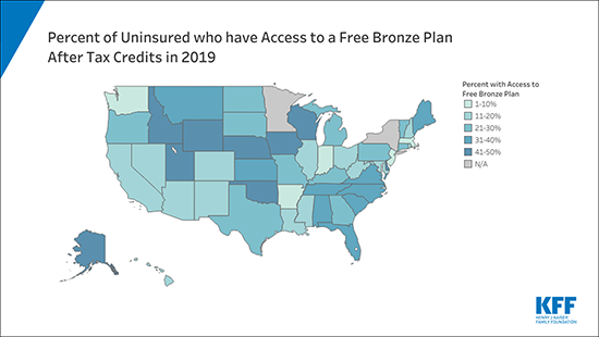That works out to 27 percent of the 15.9 million uninsured individuals who could shop in the ACA marketplaces. In some states the share with access to a free bronze plan is far higher, including: Delaware (49%), Nebraska (49%), Iowa (48%), Utah (46%), Alaska (42%), Oklahoma (42%), Wisconsin (42%), Wyoming (41%), and Idaho (40%).