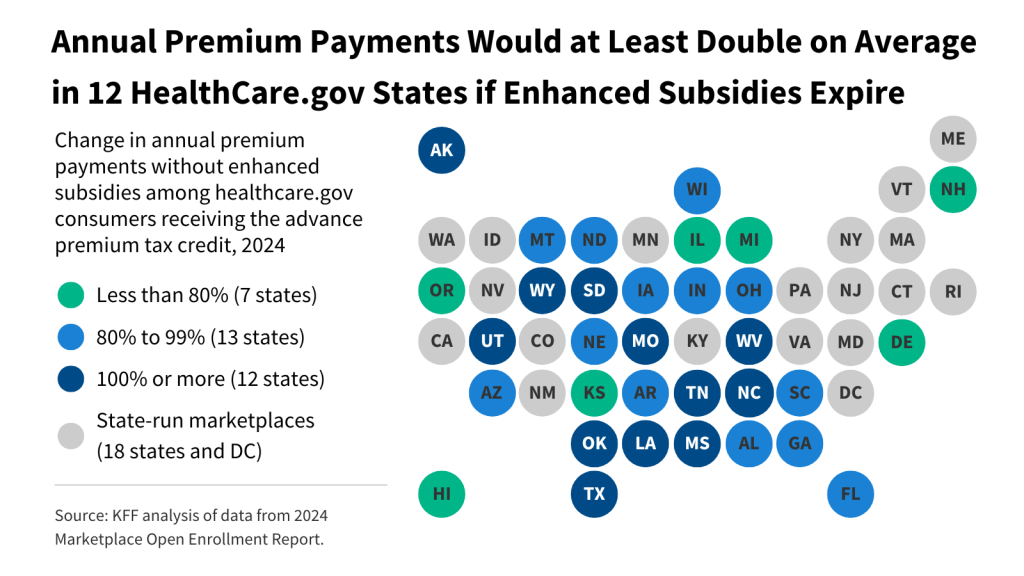 Enrollees in 12 HealthCare.gov states would see their annual payments at least double on average without enhanced subsidies