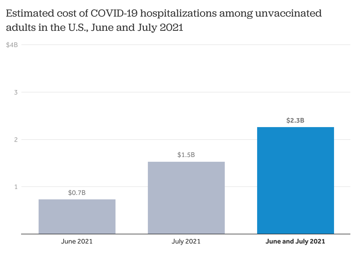 This analysis finds that over 100,000 COVID-19 hospitalizations could have been prevented with adult vaccination in June and July of this year, costing the U.S. health system over $2 billion dollars.
