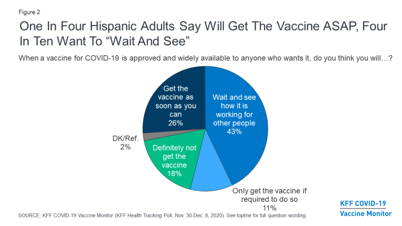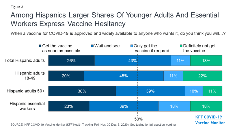 The COVID-19 pandemic has had a disproportionate impact on people of color. A previous KFF analysis found that along with Black and American Indian and Alaska Native (AIAN) people, Hispanic people were overrepresented in coronavirus cases and more likely to suffer worse outcomes than their White counterparts. Moreover, Hispanic adults have been harder hit by the economic impact of the pandemic as the December 2020 KFF COVID-19 Vaccine Monitor poll finds half (52%) of Hispanic adults say their household has lost a job or income since the coronavirus began spreading in the U.S. in February 2020 –compared to fewer White adults (42%) who say the same. With the risk of coronavirus ever present, four in ten Hispanic adults (43%) say they are essential workers required to work outside their home during the coronavirus outbreak (78% of all employed Hispanic adults compared to six in ten employed White and Black adults). With Hispanic adults being among the groups most impacted by the pandemic, the KFF COVID-19 Vaccine Monitor finds that while most Hispanics are open to getting vaccinated, there remains a sizeable share, particularly among younger Hispanics, who express at least some vaccine hesitancy. Communication efforts focused on reaching Hispanics will need to take this and other heterogeneity into account. This analysis seeks to shed light on what we know so far about vaccine hesitancy among Hispanic adults and the messages and trusted messengers that might succeed at ensuring a robust vaccination effort for this key group.