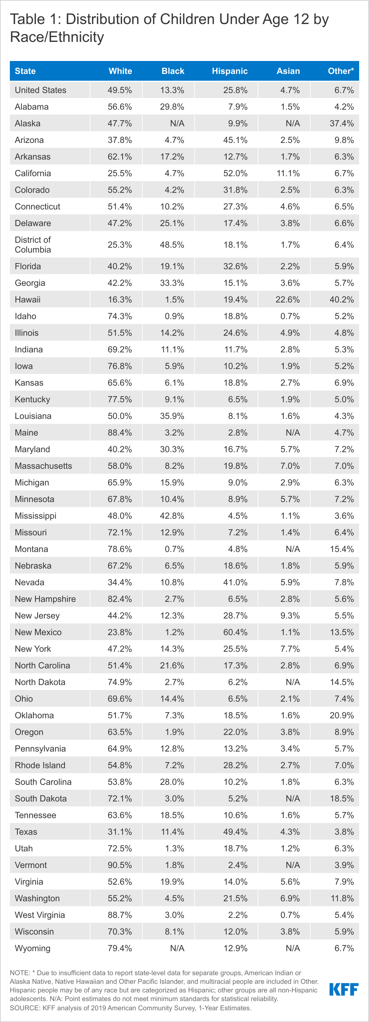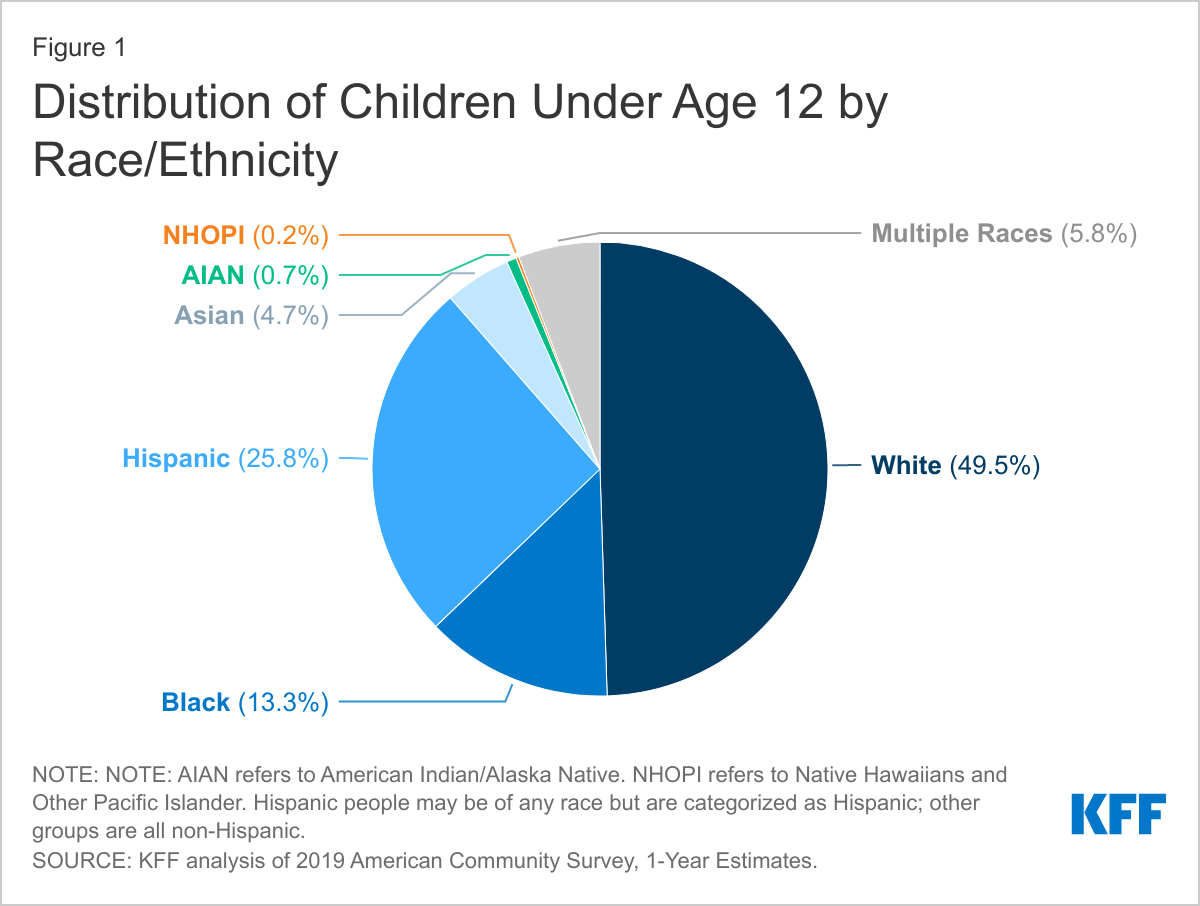 - About half (50.5%) of children under the age of 12 are children of color, including more than a quarter (25.8%) who are Hispanic. An additional 13.3% are Black, 4.7% are Asian, and the remaining 6.7% are American Indian or Alaska Native, Native Hawaiian or Other Pacific Islander, or multiracial (Figure 1). Some states have even larger shares of children of color. For example, in 5 states (Hawaii, New Mexico, the District of Columbia, California, and Texas), more than two-thirds of children under age 12 are children of color (Table 1). Over 4 in 10 children under age 12 are Hispanic in five states, including 60.4% in New Mexico and 52.0% in California. In 4 states, more than a third of children under age 12 are Black including 48.5% of children in DC and 42.8% of children in Mississippi. Over 1 in 10 children under age 12 are Asian in California (11.1%) and this share rises to nearly a quarter (22.6%) in Hawaii. Overall, children under age 12 include a larger share of people of color compared to the rest of the population (50.5% vs. 38.1%).