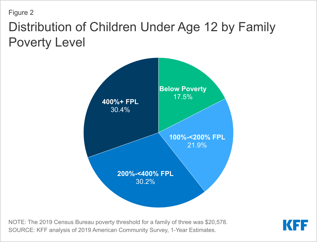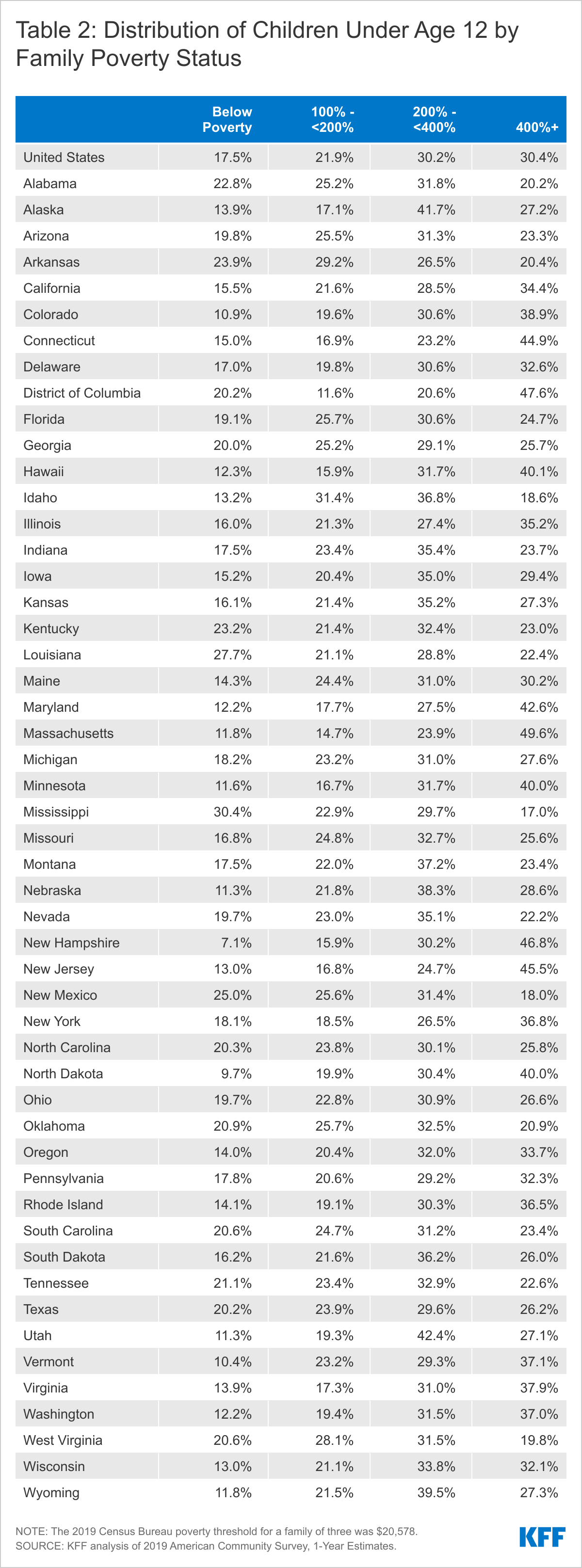 - Almost four in ten (39.4%) children under the age of 12 live in households with incomes below 200% of the Federal Poverty Level (FPL). This includes 17.5% living below poverty and 21.9% between 100-200% FPL. The remainder are split between households with incomes between 200-400% FPL (30.2%) and at or above 400% FPL (30.4%) (Figure 2). Some states have much higher shares of children living in low-income households, including 3 states with more than half of children under 12 living in households with incomes less than 200% FPL – Mississippi (53.3%), Arkansas (53.1%), and New Mexico (50.6%). In 13 states, more than one-fifth of children live below poverty (Table 2). Children under age 12 are more likely to be living in poverty compared to the rest of the population (17.5% v. 11.5%).