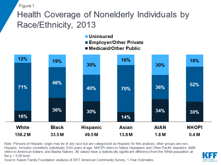 The Affordable Care Act (ACA) coverage expansions provided an opportunity to increase coverage and address longstanding racial and ethnic disparities in health coverage.1 This brief examines changes in health coverage by race and ethnicity between 2013 and 2017, providing insight into how coverage has changed since implementation of the ACA. It is based on Kaiser Family Foundation analysis of the nonelderly population using American Community Survey data. (See methods for more details). It shows: