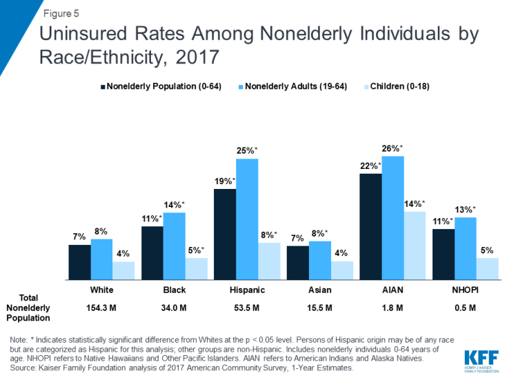 As of 2017, most groups of color remained significantly more likely to be uninsured than Whites. AIANs and Hispanics were at the highest risk of being uninsured, with over one in five (22%) AIANs and 19% of Hispanics lacking coverage compared to 7% of Whites (Figure 5). Uninsured rates for children were lower than rates for adults, but AIAN children were over three times as likely as White children to be uninsured and Hispanic children were twice as likely as White children to lack coverage.