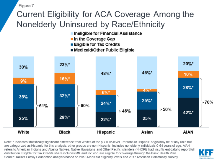 There are opportunities to increase coverage among the remaining uninsured through enrollment of eligible individuals in Medicaid or Marketplace coverage, but eligibility varies across racial and ethnic groups and many remain ineligible for assistance. In 2017, 27.4 million nonelderly people lacked health insurance. An estimated 55% of this population is eligible for financial assistance for coverage through Medicaid (25%) or the Marketplaces (30%).2 However, eligibility varies across racial and ethnic groups and many remain ineligible. For example, uninsured Blacks are more likely than Whites to fall in the coverage gap in states that have not expanded Medicaid, and uninsured Hispanics and Asians are less likely than Whites to be eligible for coverage options (Figure 7).