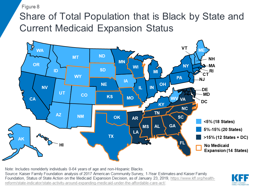 Uninsured nonelderly Blacks are more likely than Whites to fall in the coverage gap because a greater share live in states that have not implemented the Medicaid expansion. Nationwide, 2.5 million poor adults fall into a coverage gap in the 14 states that had not adopted the ACA Medicaid expansion to adults as of January 2019. Blacks make up a greater share of the population in the South, where most states have not expanded Medicaid (Figure 8).