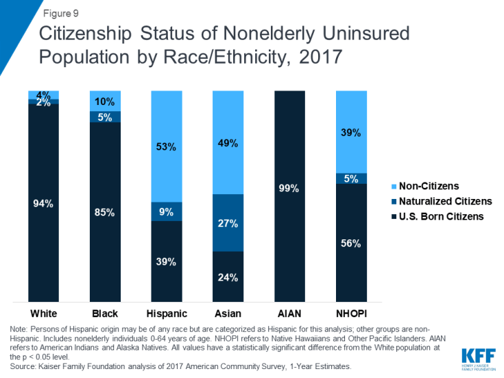Uninsured nonelderly Asians and Hispanics are less likely than Whites to be eligible for financial assistance for coverage, because they include larger shares of noncitizens who are subject to eligibility restrictions (Figure 9). Under the ACA, lawfully present immigrants continue to face eligibility restrictions for coverage, with many having to wait five years after obtaining lawful status before they may enroll in Medicaid coverage. Undocumented immigrants are not eligible to enroll in Medicaid and are prohibited from purchasing coverage through the Marketplaces.