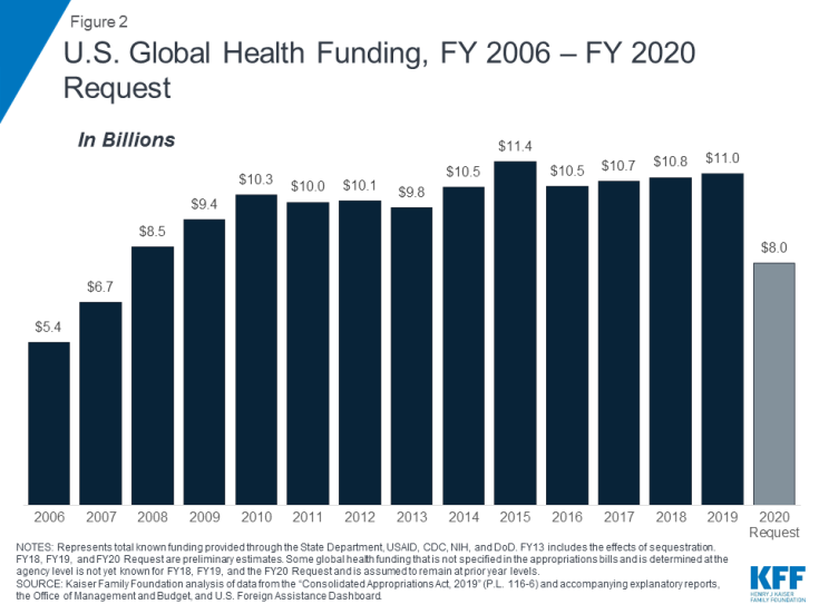 - Total U.S. global health funding was $11 billion in FY 2019, up from $5.4 billion in FY 2006; the current Administration, however, has proposed significantly reducing global health funding for FY 2020.