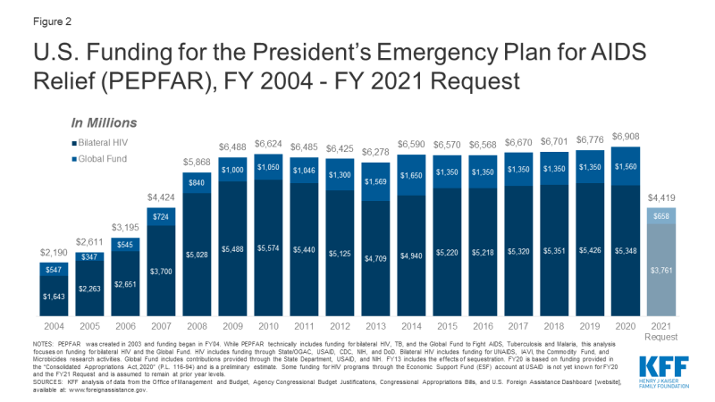 - U.S. funding for PEPFAR was $6.9 billion in FY 2020, up from $2.19 billion in FY 2004; this includes contributions to the Global Fund.