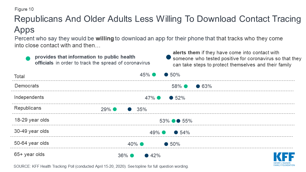- While the public is divided in their willingness to download apps for their phones as a way to trace and monitor the contacts of people infected with coronavirus, support increases to as high as 66% once people hear the argument that this could allow for many schools and businesses to reopen. Republicans are less willing to download and use a contact tracing app than Democrats and independents.