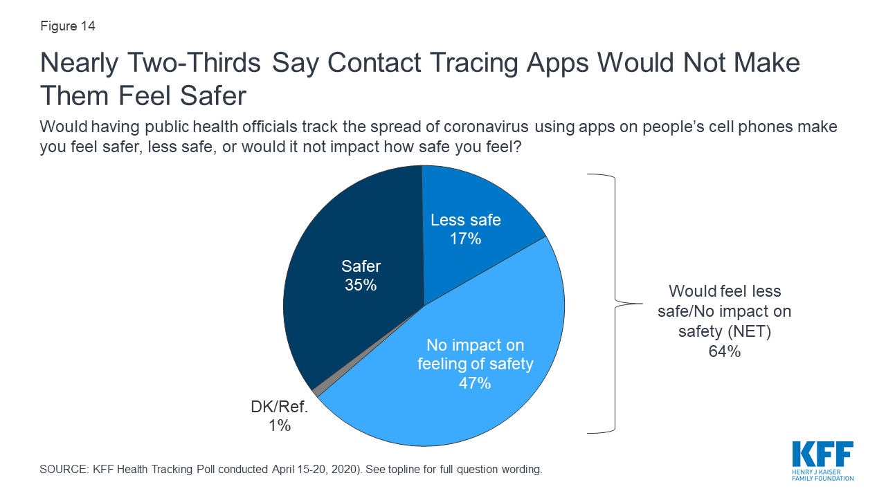 Nearly two-thirds of the public say the use of contact tracing apps either wouldn’t have any impact on how safe they feel or say they would make them feel less safe. Half of the public (47%) say having public health officials track the spread of coronavirus using apps on people’s cell phones would have “no impact on how safe they feel,” while one-third (35%) say it would make them feel “safer” and one in five (17%) say it would make them feel “less safe.”