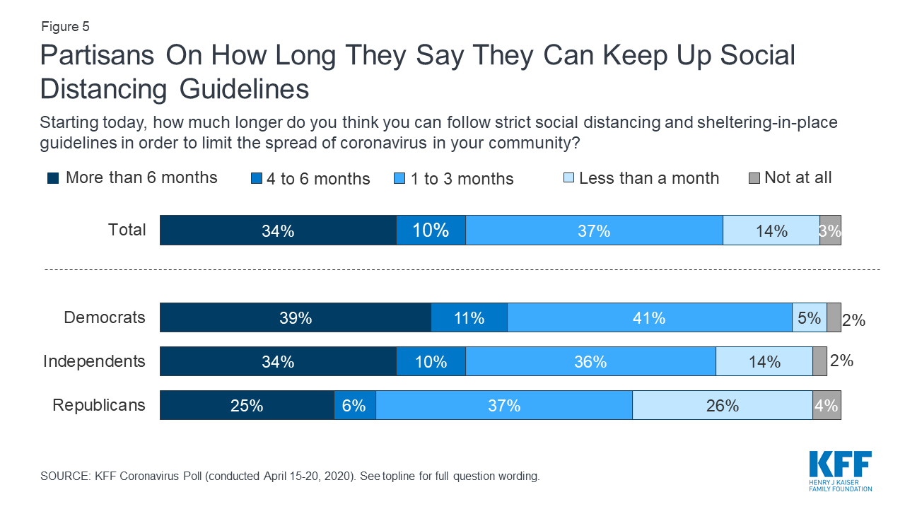 Eight in ten say they can follow strict social distancing and shelter-in-place guidelines for more than another month, including 37% who say they can follow the guidelines between 1 and 3 months, and one in ten who say they can follow them between 4 and 6 months. An additional one-third (34%) say they can follow them for more than 6 months longer, indicating there is a group of Americans who are willing to follow the guidelines as long as it takes to limit the spread of coronavirus.