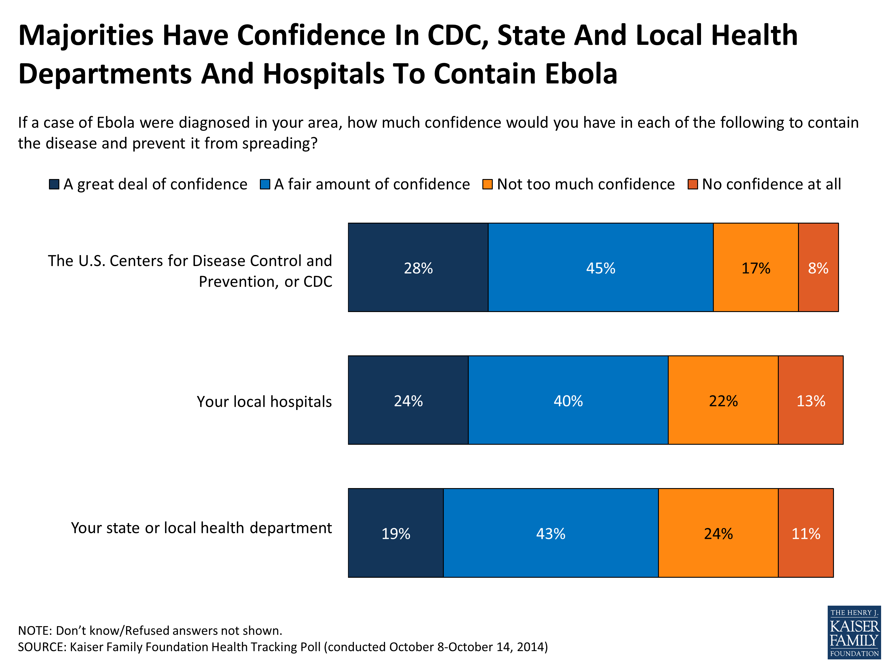 Overall, a large majority of the American public trusts local, state, and federal health authorities to contain any potential Ebola cases. About three-quarters (73 percent) say that if there were an Ebola case in their area, they would have “a great deal” or “a fair amount” of confidence in the U.S. Centers for Disease Control and Prevention (CDC), to contain Ebola and prevent it from spreading. Somewhat smaller shares – but still over six in ten – say they have at least a fair amount of confidence in their local hospitals (64 percent) and in their state or local health department (62 percent) to prevent the spread of Ebola.