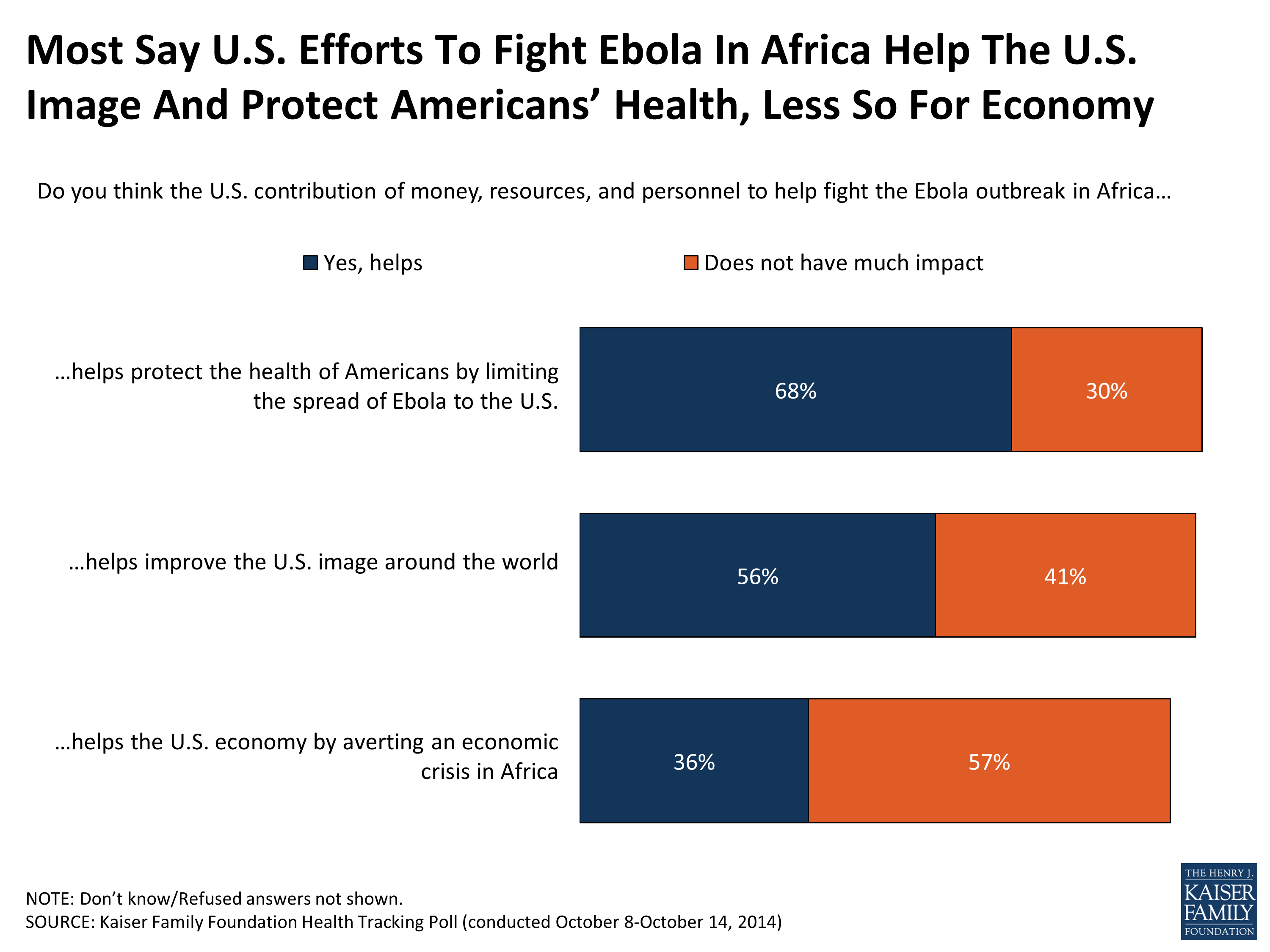 Most Americans think that U.S. contributions of money, resources, and personnel to fight Ebola in Africa help protect the health of Americans by limiting the spread of Ebola to the U.S. (68 percent) and a somewhat smaller share think these contributions help improve the U.S. image around the world (56 percent). However, when asked if these efforts help the U.S. economy by averting economic crisis in Africa, most (57 percent) said they do not have much impact.