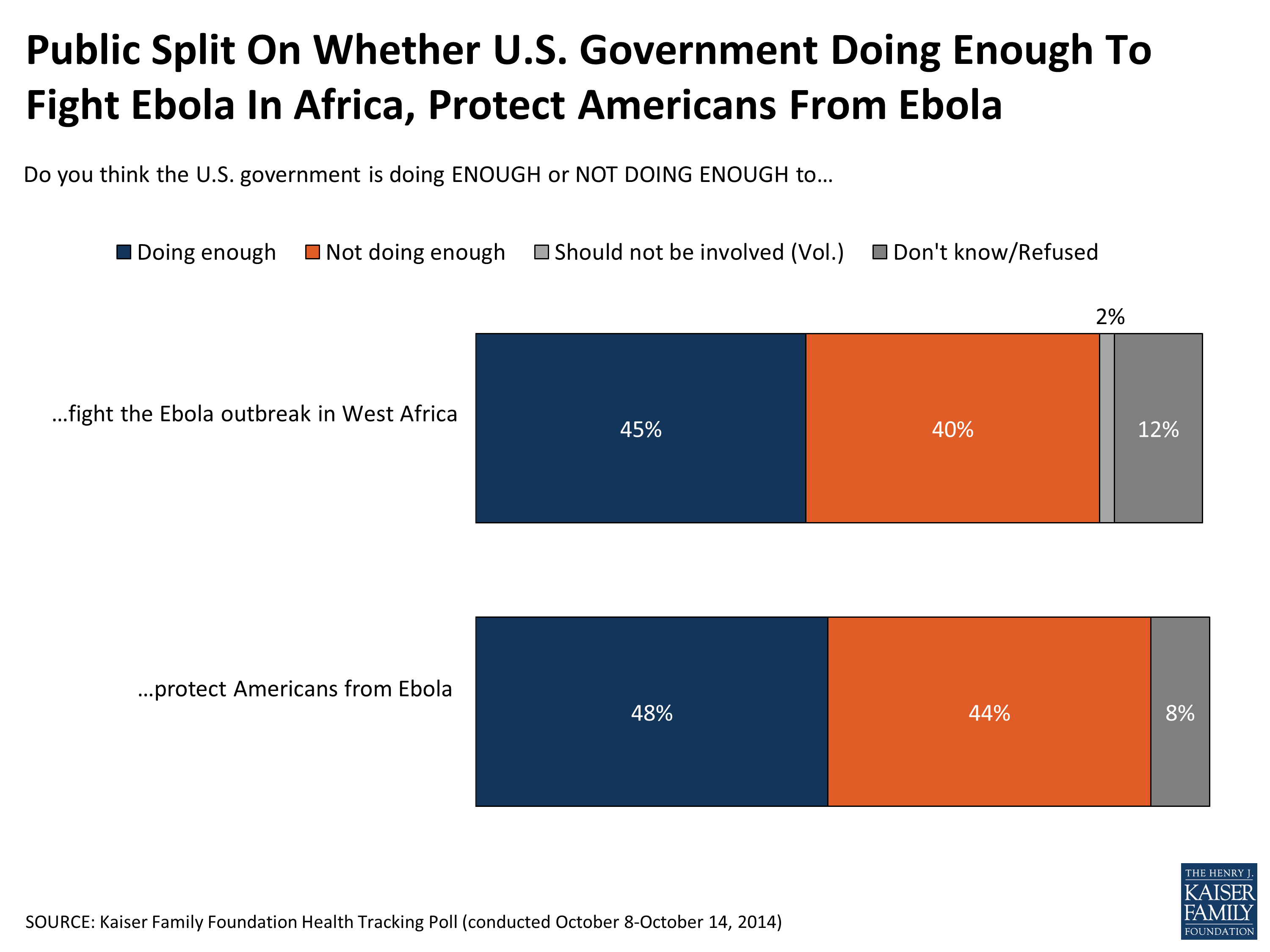 With the Ebola outbreak in West Africa and individual cases in the U.S. and Europe making international headlines, the latest Kaiser Health Policy News Index examines Americans’ attention to the Ebola crisis, awareness of key facts about the disease, and views of the U.S. role in addressing Ebola in Africa and at home. Fielded October 8-14, during which time a nurse in Dallas became the second patient diagnosed with Ebola in the U.S.1 , the survey finds that Ebola tops the list of news stories followed by the public this month, with U.S. airstrikes against Islamic militants the only other story garnering similar levels of attention. While the vast majority of the public knows the basics of how the virus is transmitted – through direct contact with the bodily fluids of someone who is sick with Ebola – fewer are aware that a person with Ebola must be showing symptoms in order to be contagious. Nearly two-thirds say they are at least somewhat worried the U.S. will see a large number of Ebola cases, and about four in ten are worried that they or a family member will contract the disease. Still, a majority believes the most likely scenario is that Ebola will be contained to a small number of cases in the U.S., and most trust their local, state, and federal health authorities to prevent Ebola’s spread. Most Americans – including majorities of Republicans, Democrats, and Independents – think the U.S. should play a major role in addressing the Ebola outbreak in Africa. Majorities support the U.S. providing financial aid, medical supplies and personnel, and fewer but still a majority support sending troops and military personnel to fight Ebola in Africa, with the public’s top two reasons for providing such support being to protect the health of Americans and to save lives in the African countries affected. The public is divided about whether the U.S. government is doing enough to fight Ebola abroad and at home.