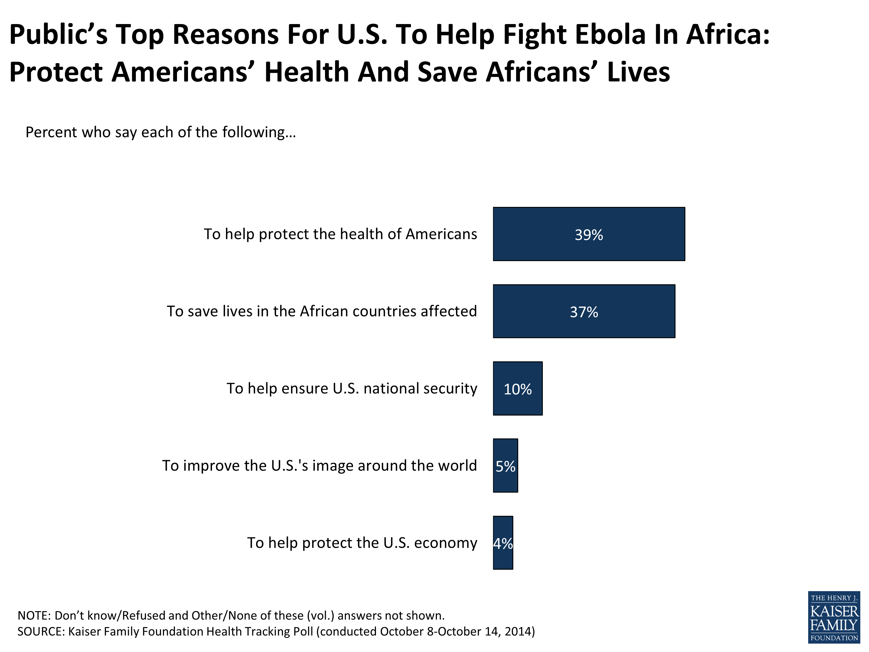 When asked the MOST important reason for the U.S. to contribute to these efforts, the top two are to help protect the health of Americans (39 percent) and to save lives in the African countries affected (37 percent). Much smaller shares say the most important reason for the U.S. to contribute is to help ensure U.S. national security (10 percent), to improve the U.S. image around the world (5 percent), or to help protect the U.S. economy (4 percent).