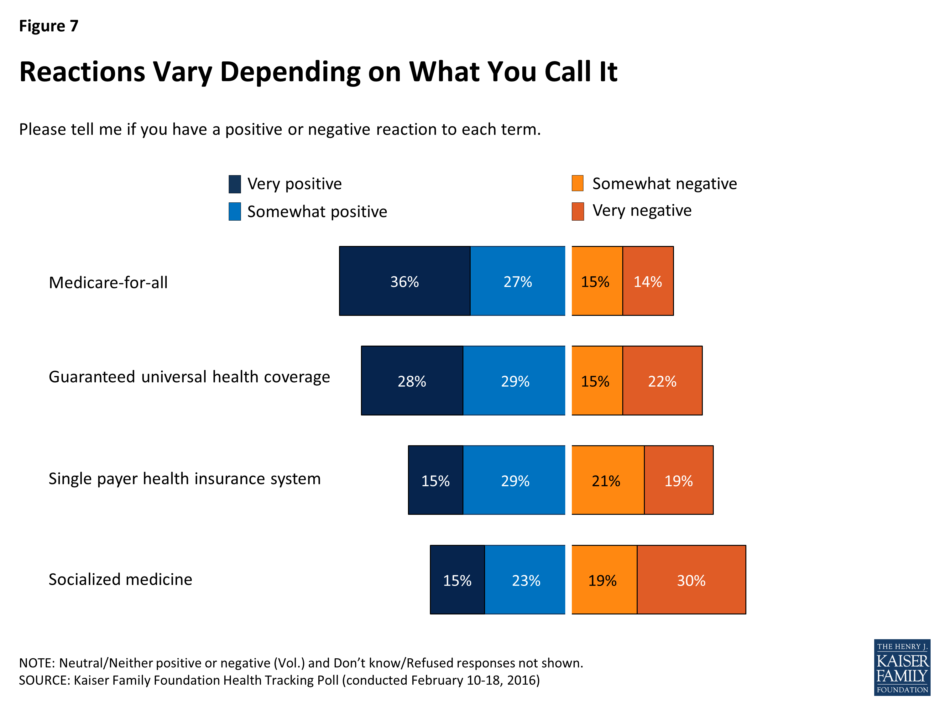 Politicians and pundits use a variety of terms to describe the idea of expanding health insurance coverage to all Americans and this month’s poll explores the public’s reaction to a few of these terms. Nearly two-thirds (64 percent) of Americans say they have a positive reaction to the term “Medicare-for-all” and more than half (57 percent) say they have a positive reaction to the term “guaranteed universal health coverage.” Less than half of Americans report a positive association with the phrases “single payer health insurance system” (44 percent) and “socialized medicine” (38 percent).