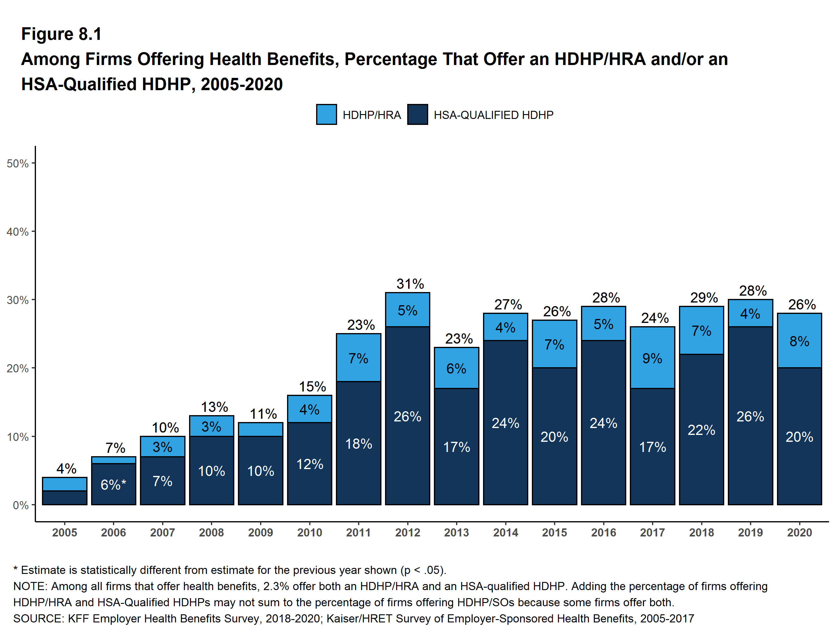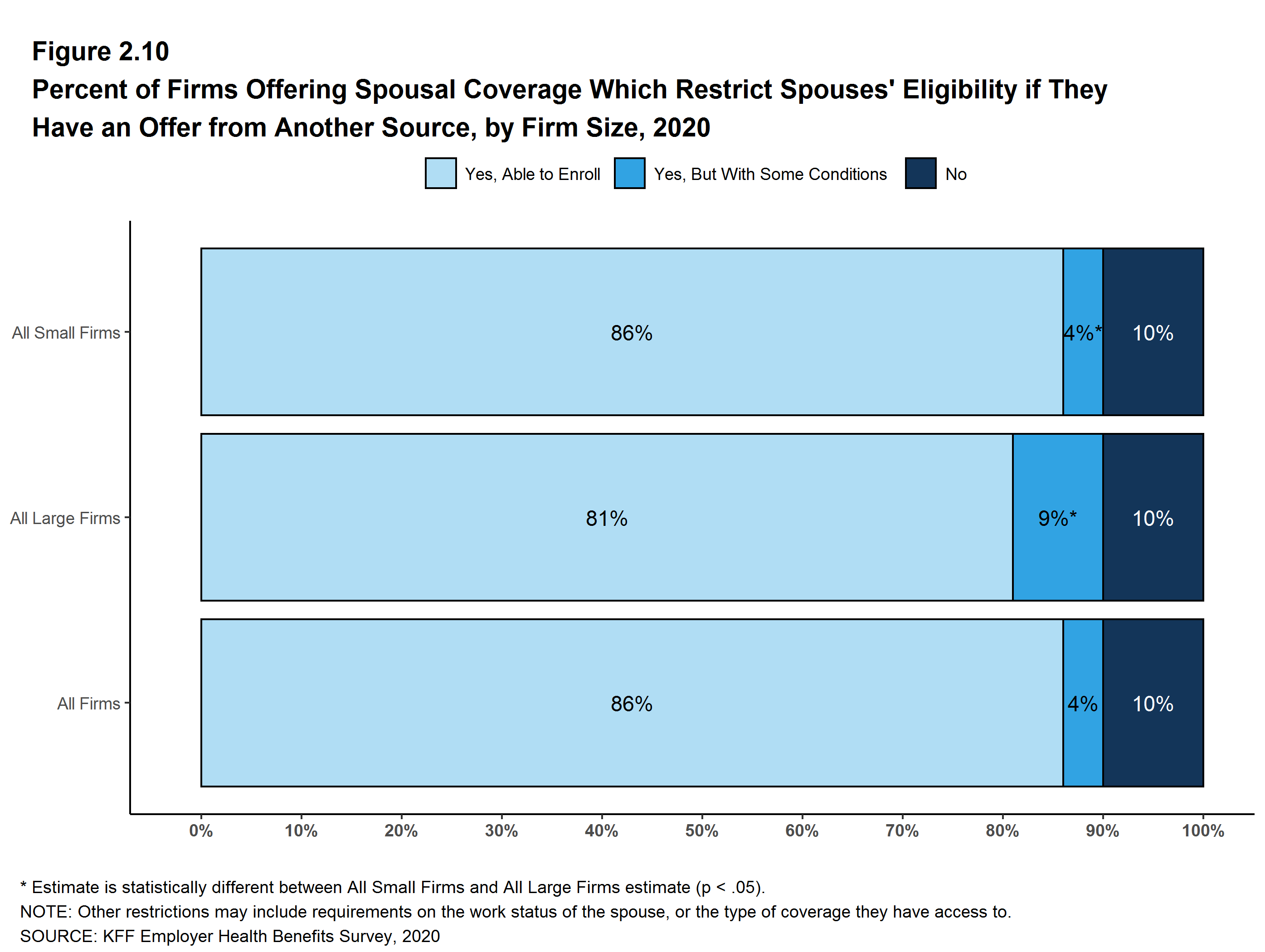 The Kaiser Family Foundation 2020 Employer Health Benefits Survey reports findings from a telephone survey of 1,765 randomly selected non-federal public and private employers with three or more workers. Researchers at NORC at the University of Chicago and the Kaiser Family Foundation designed and analyzed the survey. Davis Research, LLC conducted the fieldwork between January and July 2020. In 2020, the overall response rate is 22%, which includes firms that offer and do not offer health benefits. Among firms participating in the past two years, the survey’s response rate is 51%. Unless otherwise noted, differences referred to in the text and figures use the 0.05 confidence level as the threshold for significance. Small firms have 3-199 workers. Values below 3% are not shown on graphical figures to improve the readability of those graphs. Some distributions may not sum due to rounding. For the first time since 1999, we contracted with a new data collection firm to conduct the survey. For more information on potential ‘house effects’ resulting from this change, as well as information on changes to our weighting methodology and measurements of workers’ wage and inflation see the Survey Design and Methods section.