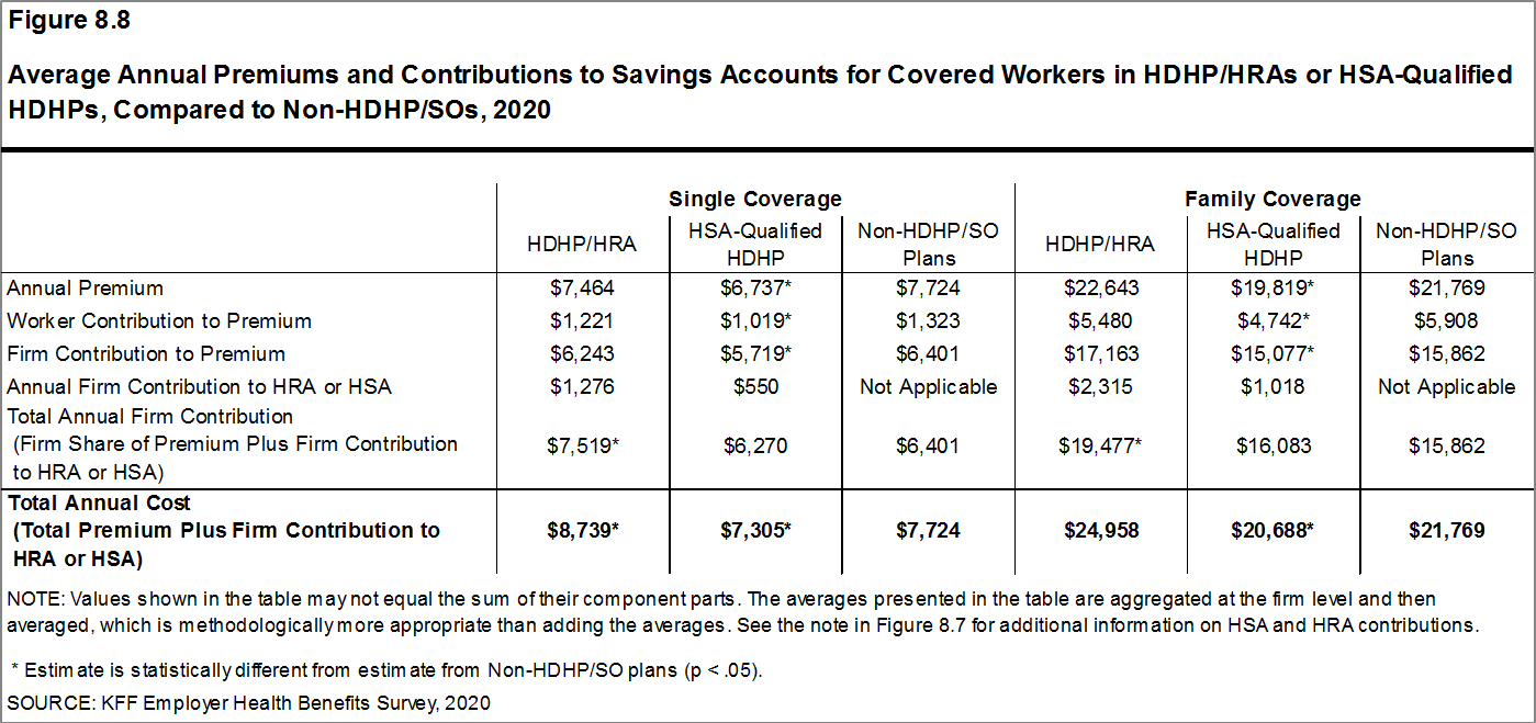 Deductibles have increased in recent years due to higher deductibles within plan types and higher enrollment in HDHP/SOs. While growing deductibles in PPOs and other plan types generally increase enrollee out-of-pocket liability, the shift to enrollment in HDHP/SOs does not necessarily do so if HDHP/SO enrollees receive an offsetting account contribution from their employers. Ten percent of covered workers in an HDHP with a Health Reimbursement Arrangement (HRA), and 3% of covered workers in a Health Savings Account (HSA)-qualified HDHP receive an account contribution for single coverage at least equal to their deductible, while another 41% of covered workers in an HDHP with an HRA and 19% of covered workers in an HSA-qualified HDHP receive account contributions that, if applied to their deductible, would reduce their actual liability to less than $1,000.