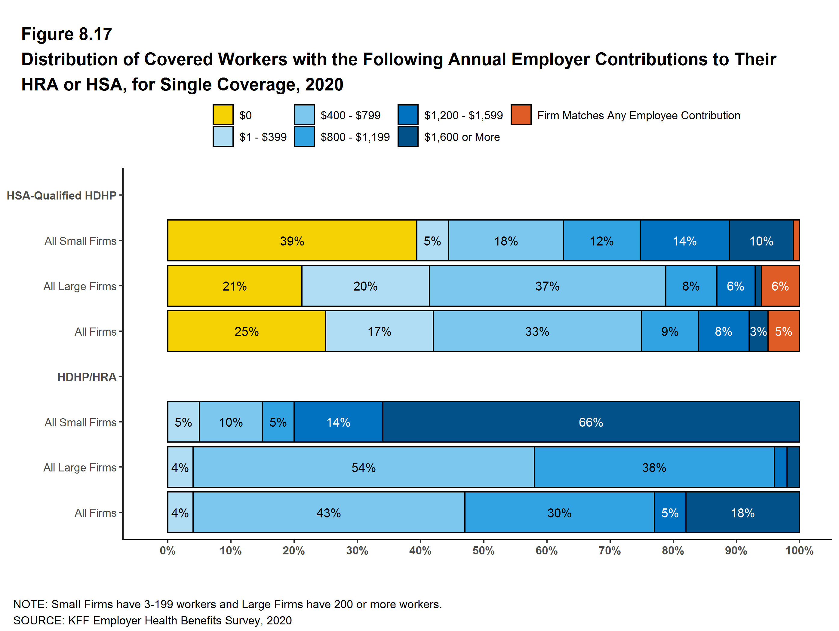 - Among employers with 50 or more employees offering health benefits, 7% have a program that reduces cost sharing for lower-wage workers. Among firms with 50 or more employees offering health benefits that make contributions to workers’ HSA or HRAs, 1% provide larger account contributions for their lower-wage workers [Figure 13.15].