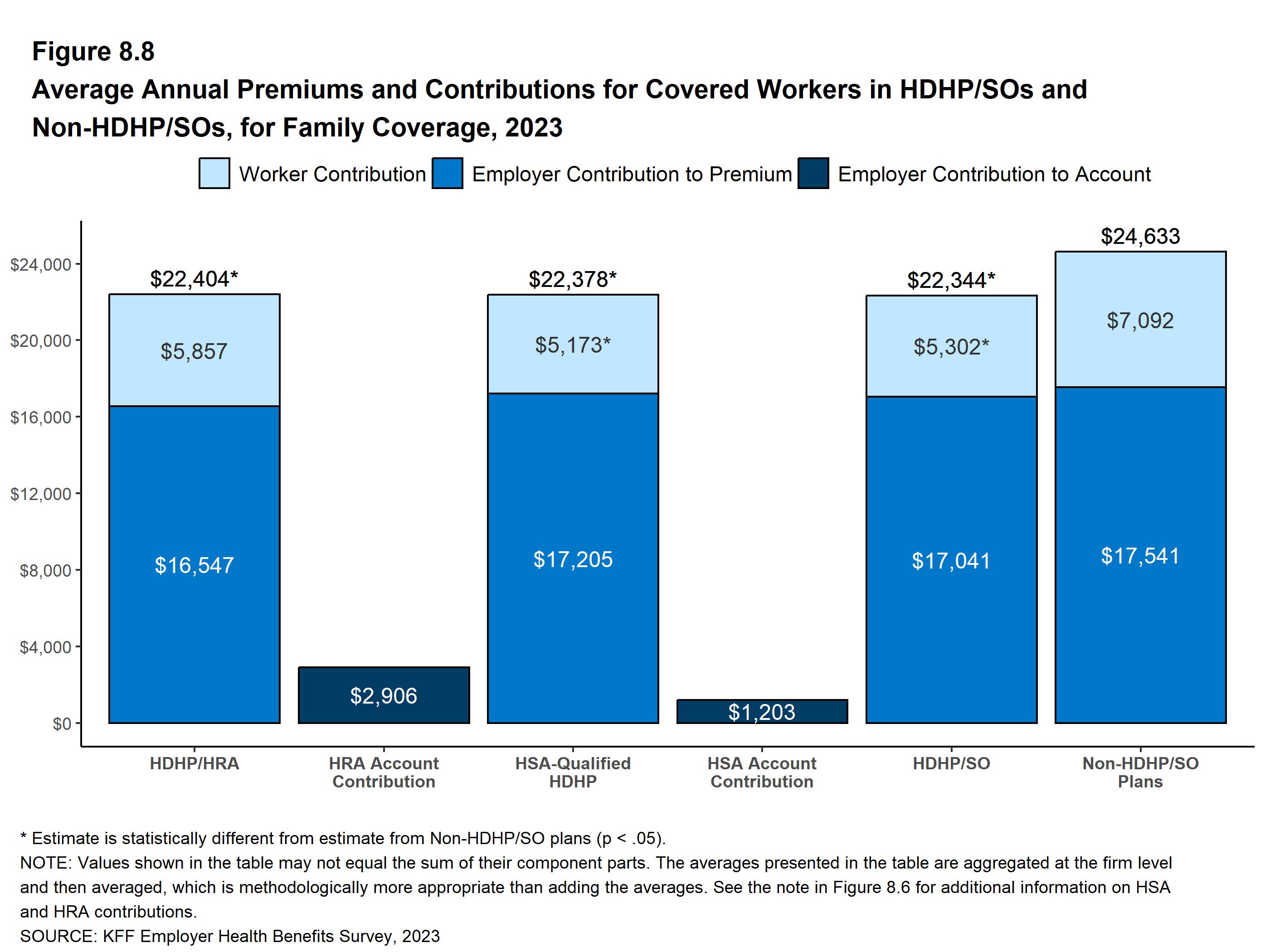 Some workers in health plans with high deductibles also receive contributions to savings accounts from their employers. These contributions can be used to reduce cost sharing amounts. Seven percent of covered workers in an HDHP with a Health Reimbursement Arrangement (HRA), and 4% of covered workers in a Health Savings Account (HSA)-qualified HDHP receive an account contribution for single coverage that is greater than or equal to their deductible amount. Additionally, 34% of covered workers in an HDHP with an HRA and 12% of covered workers in an HSA-qualified HDHP receive account contributions that, if applied to their deductible, would reduce their personal annual liability to less than $1,000.