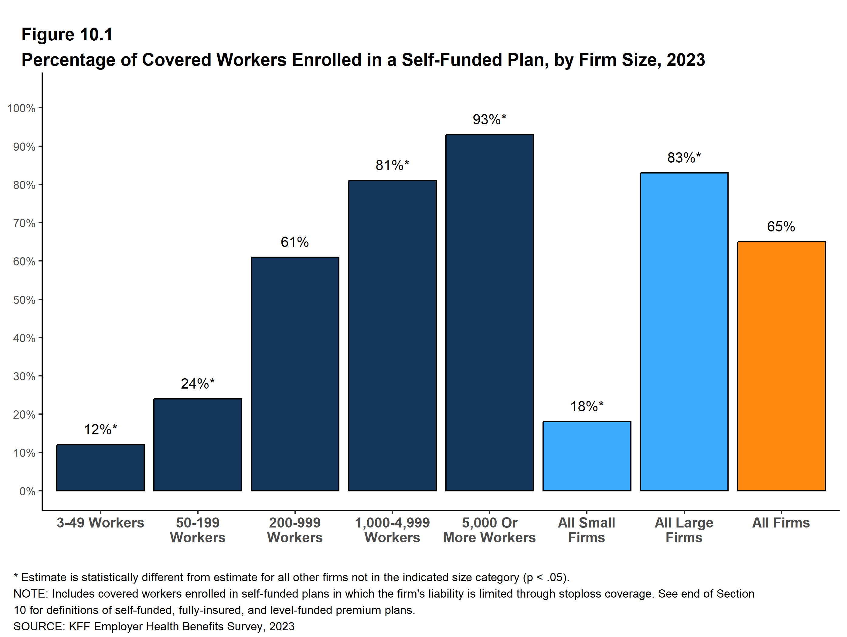 Many firms – particularly larger firms – self-fund, which means that they pay for the health services for their workers directly from their own funds rather than through the purchase of health insurance. Sixty-five percent of covered workers, including 18% of covered workers at small firms and 83% at large firms are enrolled in plans that are self-funded. The percentage of covered workers in self-funded plans in 2023 is similar to last year.