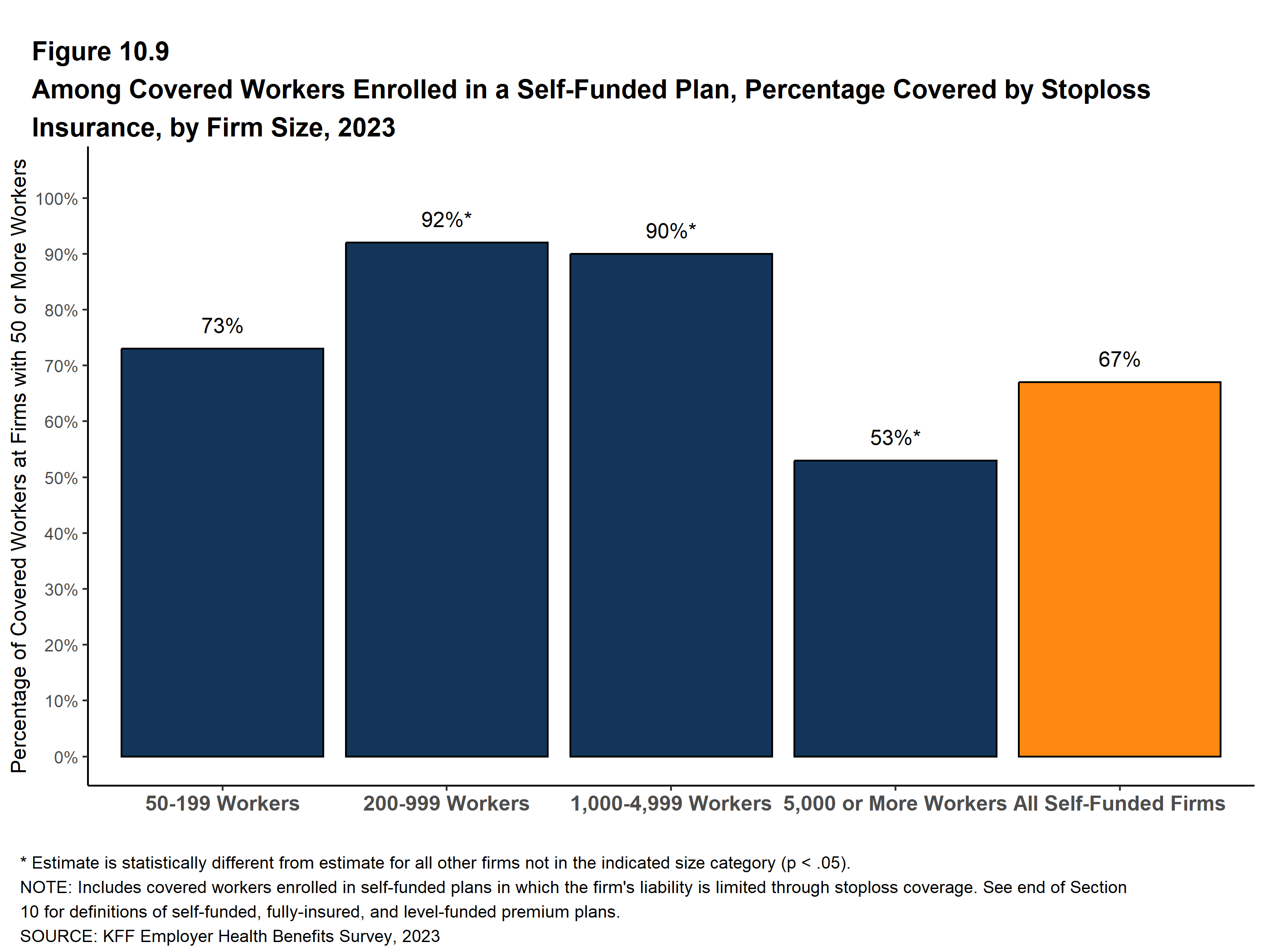 Thirty-four percent of small firms offering health benefits report that they have a level-funded plan, similar to the percentage in 2022. Level-funded arrangements combine a relatively small self-funded component with stop-loss insurance, which limits the employer’s liability and transfers a substantial share of the risk to insurers. These plans have the potential to meaningfully affect competition in the small group market because, unlike insured plans, they use health status as a factor in rating and underwriting and are not required to provide all of the essential health benefits that are mandatory for other plans..