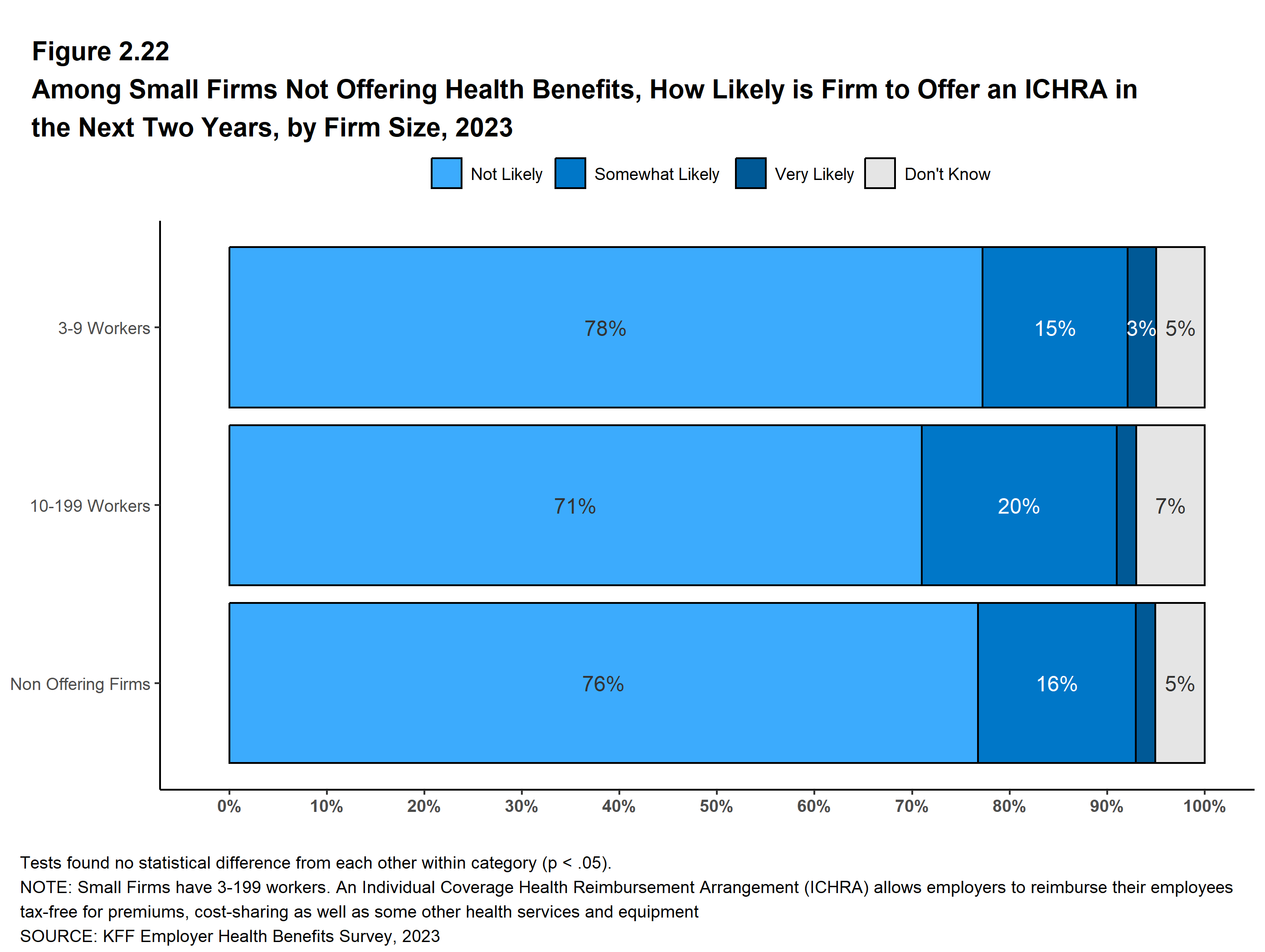 While nearly all large firms (firms with 200 or more workers) offer health benefits to at least some workers, small firms (3-199 workers) are significantly less likely to do so. In 2023, 53% of all firms offered some health benefits, similar to the percentage last year (51%).