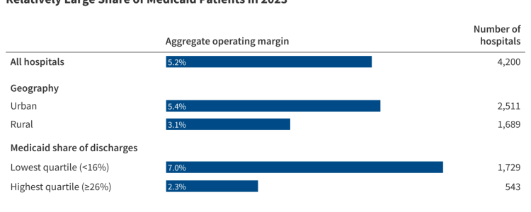 This data note examines trends in hospital margins from 2018 through 2023 and how operating margins varied across different types of hospitals in 2023. It shows the industry overall experienced a rebound in 2023 after margins fell sharply the previous year, though some hospitals – particularly those in rural areas and those who see many Medicaid patients – continue to struggle.