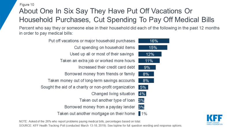 Those who report problems paying medical bills in the past year report a number of different responses to those challenges with the most common being putting off vacations or major household purchases (16 percent) or cutting spending on household items (15 percent). Slightly fewer (about one in ten) say they have used up all or most of their savings (12 percent), taken an extra job or worked more hours (11 percent), increased their credit card debt (9 percent), borrowed money (8 percent), or taken money out of long-term savings accounts (8 percent).