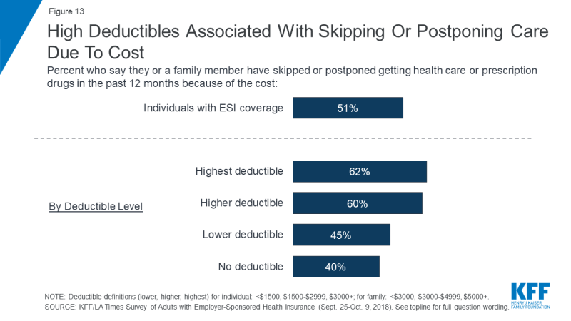 Having health coverage does not mean that workers are getting the care they think they need as about half of individuals with employer-sponsored insurance say they or a family member have skipped or postponed getting health care or prescription drugs in the past 12 months because of cost. This is even higher among employees with higher deductibles with six in ten of those with a deductible of at least $1500 for an individual or $3000 for a family say they have skipped or postponed care.