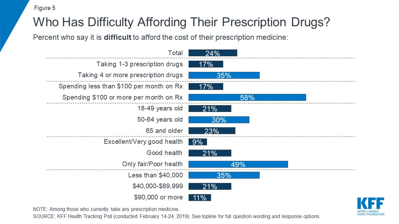 For many Americans, prescription drugs are another component of their routine care. Among those currently taking prescription drugs (62 percent of adults), about one-fourth (24 percent) and a similar share of seniors (23 percent) say it is difficult to afford their prescription drugs, including about one in ten saying it is “very difficult.” Certain groups are much more likely to report difficulty affording medication, including those who spend $100 or more a month on their prescriptions (58 percent), those who report being in fair or poor health (49 percent), those who take four or more prescription drugs (35 percent), and those earning less than $40,000 annually (35 percent) (see Tables A.3 and A.4).