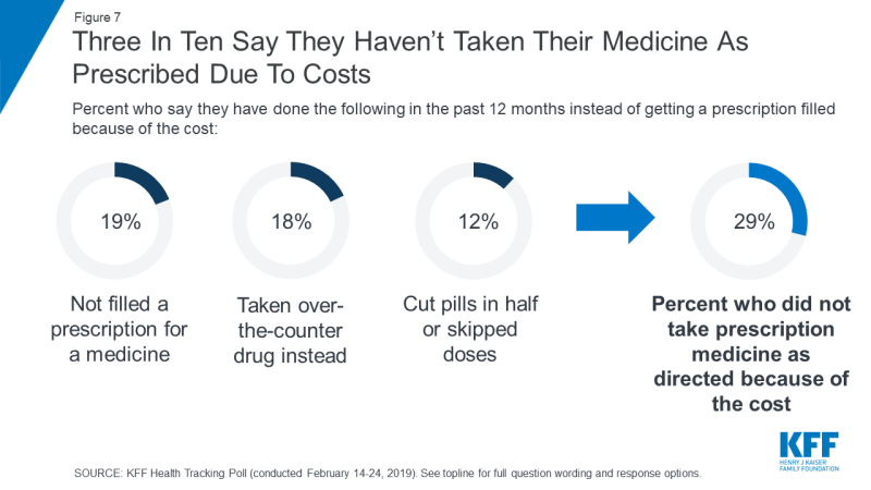In addition to putting off care, about three in ten of all adults (29 percent) report not taking their medicines as prescribed at some point in the past year because of the cost. This includes about one in five who report that they haven’t filled a prescription (19 percent of total) or took an over-the counter drug instead (18 percent of total), and about one in ten who say they have cut pills in half or skipped a dose. In addition, three in ten (29 percent) of those who report not taking their medicines as prescribed say their condition got worse as a result of not taking their prescription as recommended (eight percent of total).